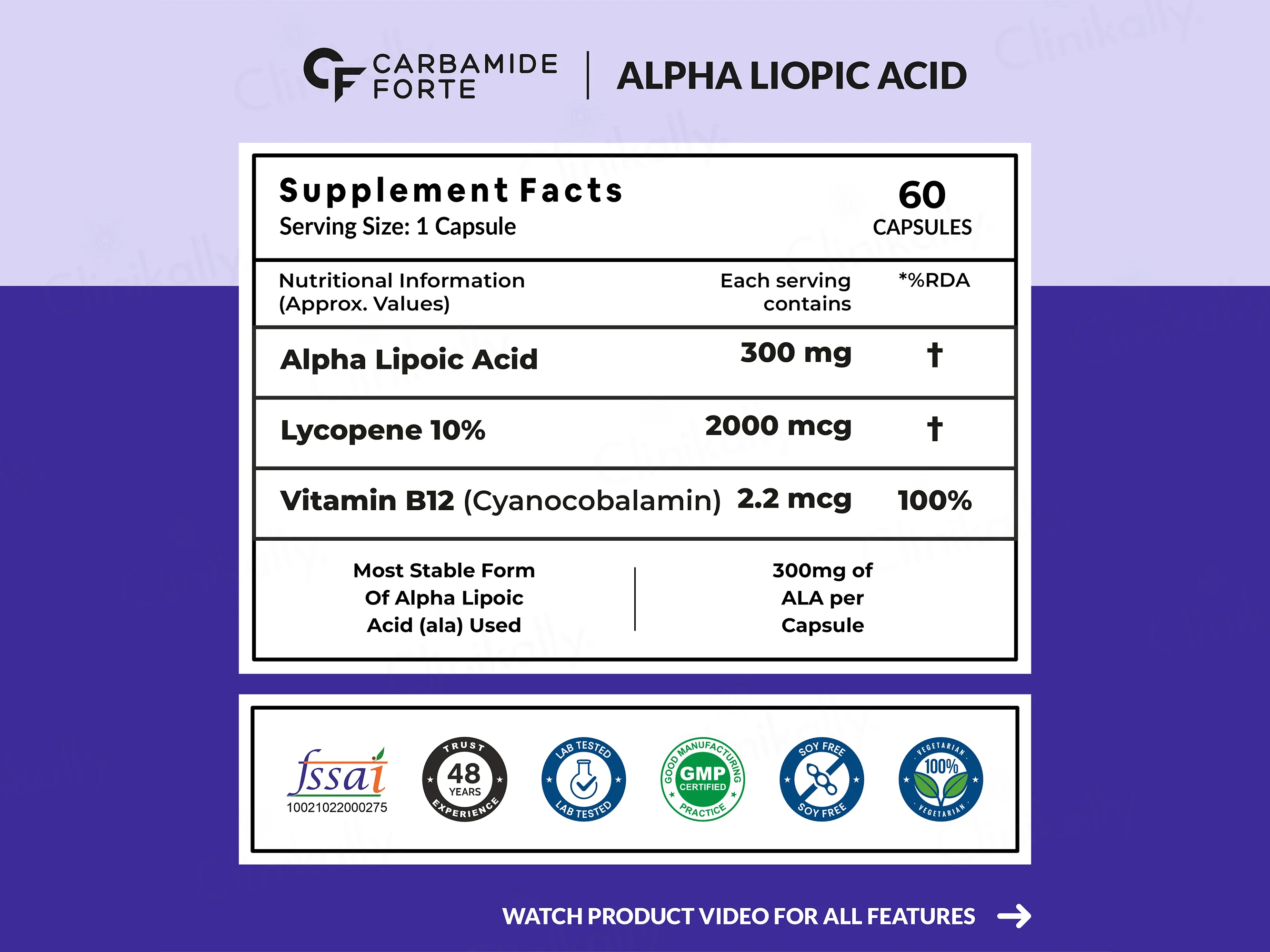 Carbamide Forte Alpha Lipoic Acid 300mg Capsule is a powerful antioxidant supplement designed to promote overall well-being. Packed with 300mg of the most stable form of Alpha Lipoic Acid (ALA), it helps boost energy production, support liver health, and maintain healthy blood sugar levels. With added benefits of Vitamin B12 and Lycopene, this supplement also helps fight free radicals and slows down aging, ensuring better focus and concentration. It’s ideal for those looking to enhance their antioxidant intake and improve their health.