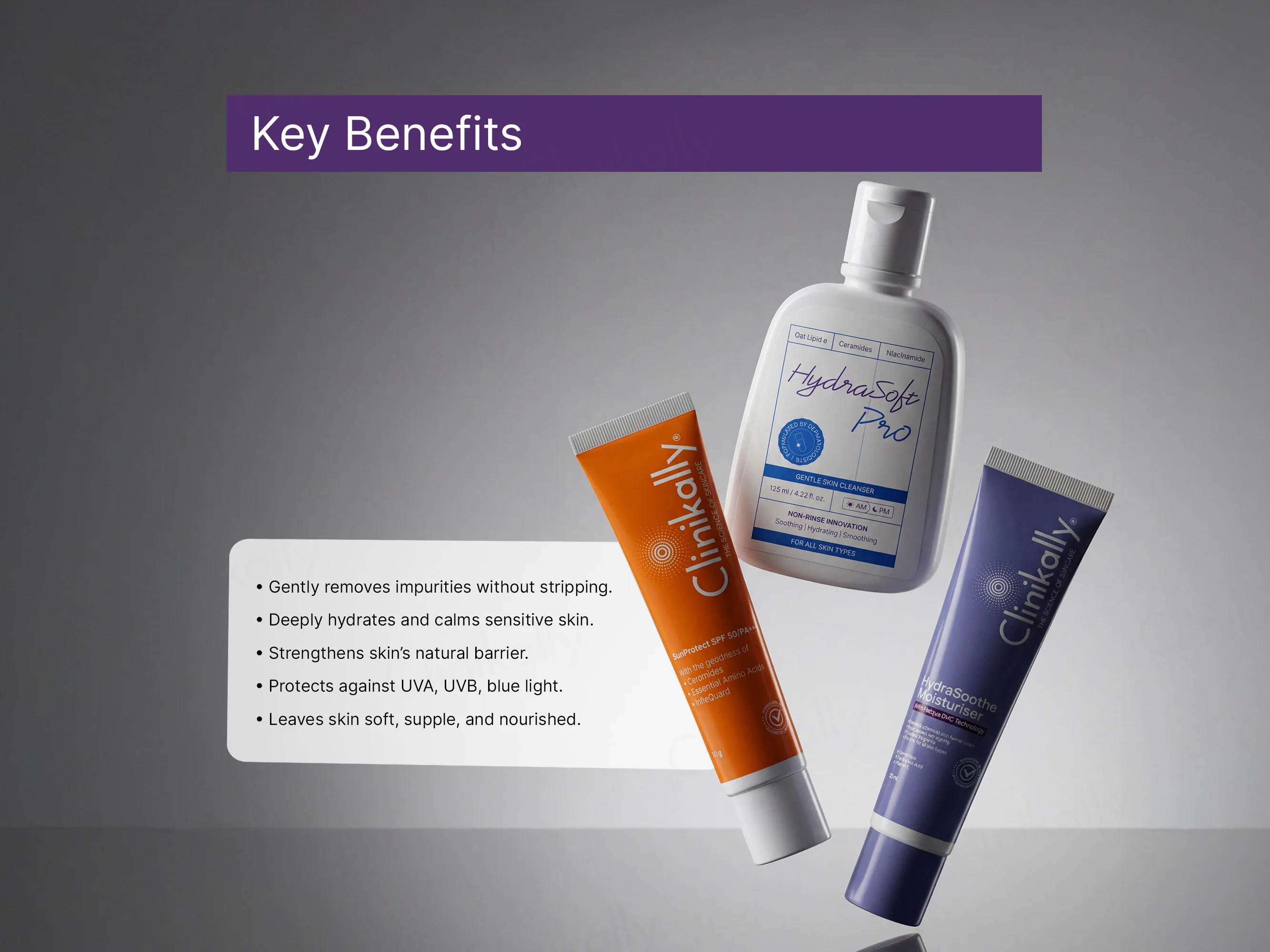 Clinikally Skin Routine Starter Kit – Limited Edition is a complete everyday skincare routine set that gently cleanses, intensely hydrates, and provides broad-spectrum sun protection. This limited-edition kit includes a dermatologist-formulated non-rinse cleanser that lifts dirt, oil, and makeup while calming and strengthening the skin; a soothing, ceramide-rich moisturiser that locks in hydration and repairs the skin barrier; and a lightweight SPF50/PA+++ sunscreen that shields the skin from harmful UVA/UVB, infrared, and blue light while nourishing with antioxidants and ceramides. Together, these three steps work to deeply cleanse, comfort dry and sensitive skin, improve texture, and defend against environmental aging for healthy, smooth, and protected skin from AM to PM.