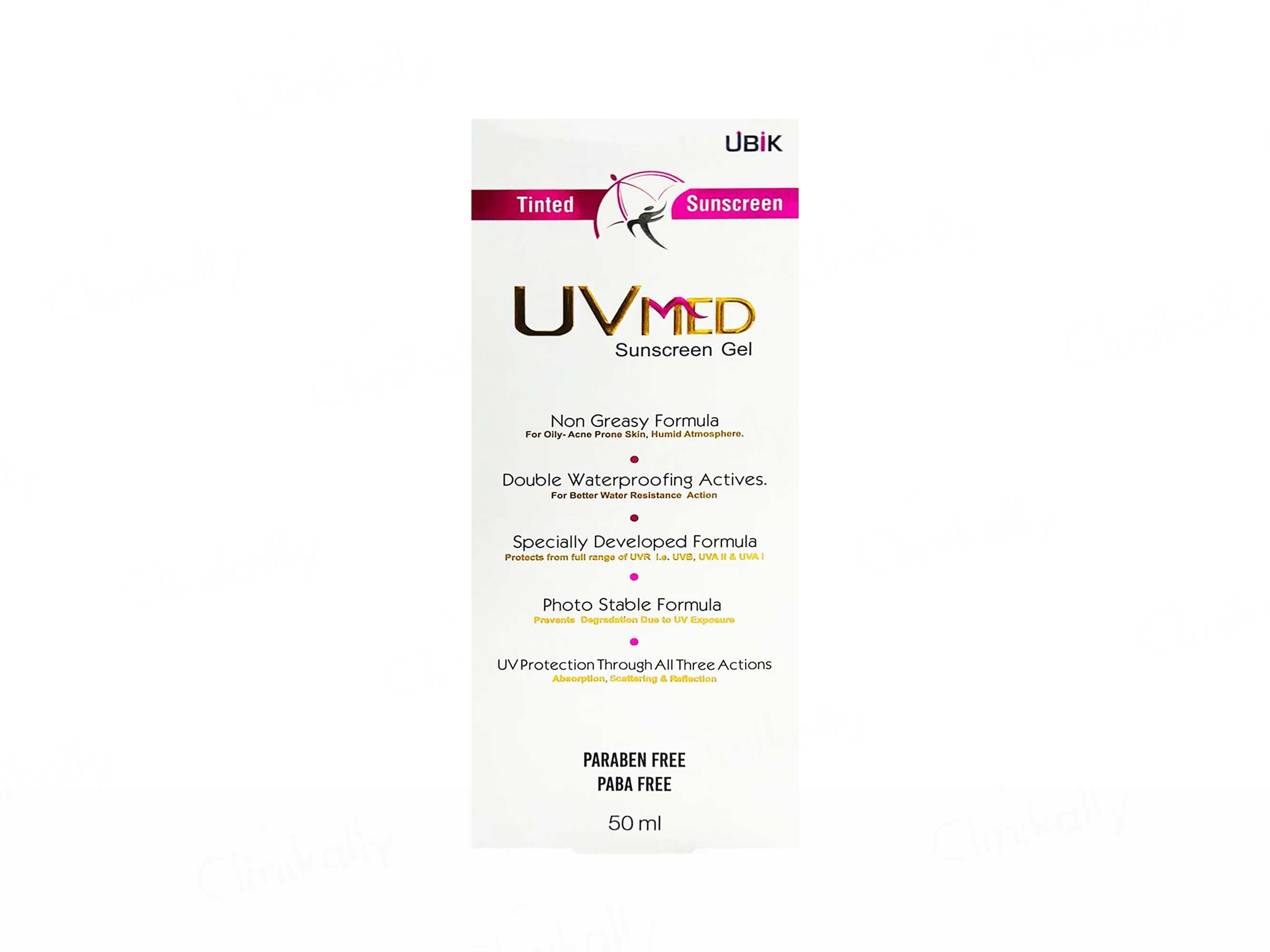Uvmed Tinted Sunscreen Gel SPF 50 is a high-performance sunscreen designed to provide superior protection against harmful UVA and UVB rays. Infused with Titanium Dioxide, this tinted gel offers broad-spectrum protection with a critical wavelength of 379, ensuring effective defense against sun damage. Free from Avobenzone, it is gentle on the skin and suitable for all skin types. The lightweight, non-greasy formula blends seamlessly, providing a natural tint while protecting and nourishing the skin. Ideal for daily use, this sunscreen gel helps prevent premature aging and sun-induced pigmentation, and maintains healthy, radiant skin.